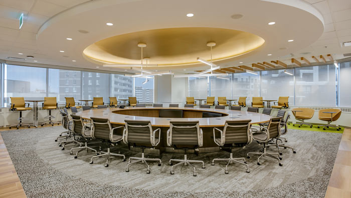 會(huì)議室效果圖:圓形的會(huì)議桌椅占據(jù)了空間的中心區(qū)域,將空間的中心完美的使用起來(lái),外環(huán)設(shè)計(jì)師利用吧臺(tái)桌椅搭建一個(gè)環(huán)形的座椅,以此加大會(huì)議室的實(shí)用率。