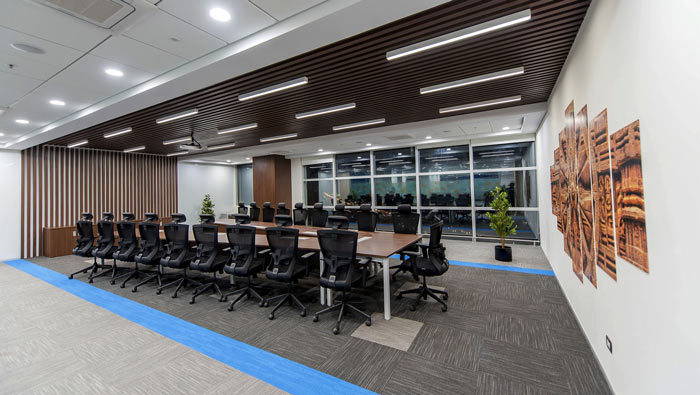 辦公會議室裝修效果圖:由顏色框定的會議空間,正是設(shè)計師為企業(yè)專門定制的,這樣可以減少隔墻對空間的影響,斜放的會議桌椅,讓空間不會那么呆板。
