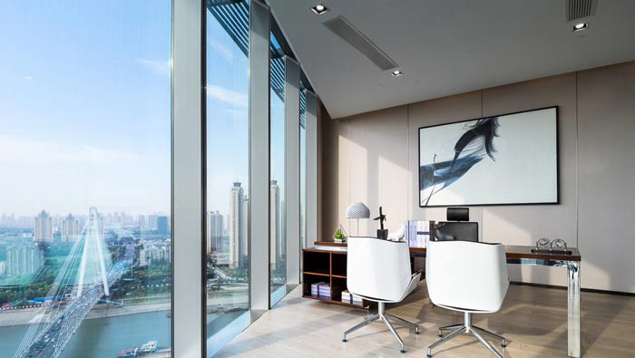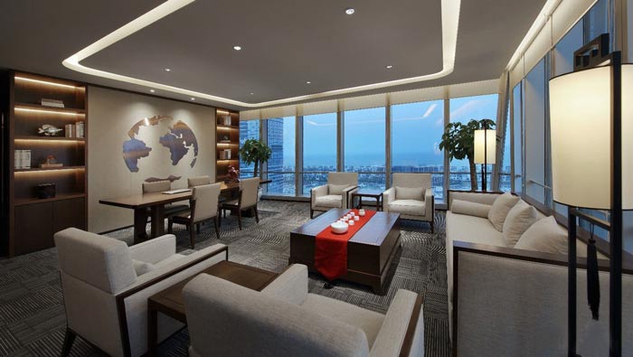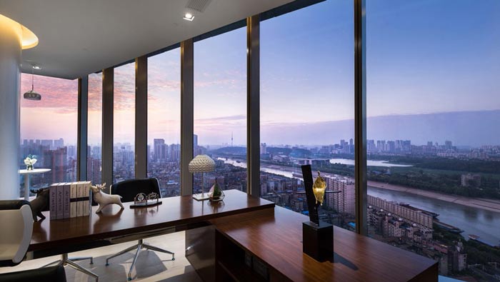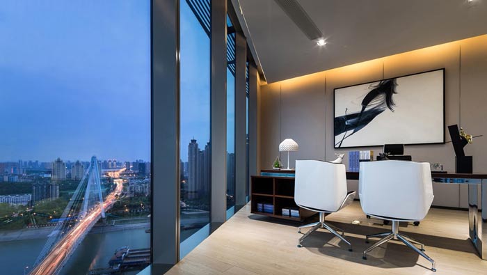 老總辦公室設計:到了黃昏,整個城市車水馬龍,一派歸家的場景,老板好像局外人一樣俯視著一切,讓勞累了一天的心慢慢靜下來,出世與入世竟在一念之間。