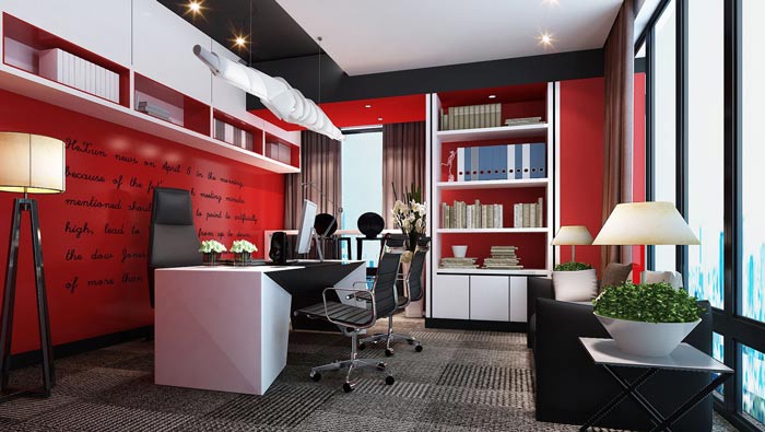 老總辦公室設計:紅色讓空間有紅紅火火之意,設計師為了避免紅色給老板的工作帶來影響,故此將其安置在座位的后方,陽光照進空間,整個空間顯出一派生機勃勃的景象。